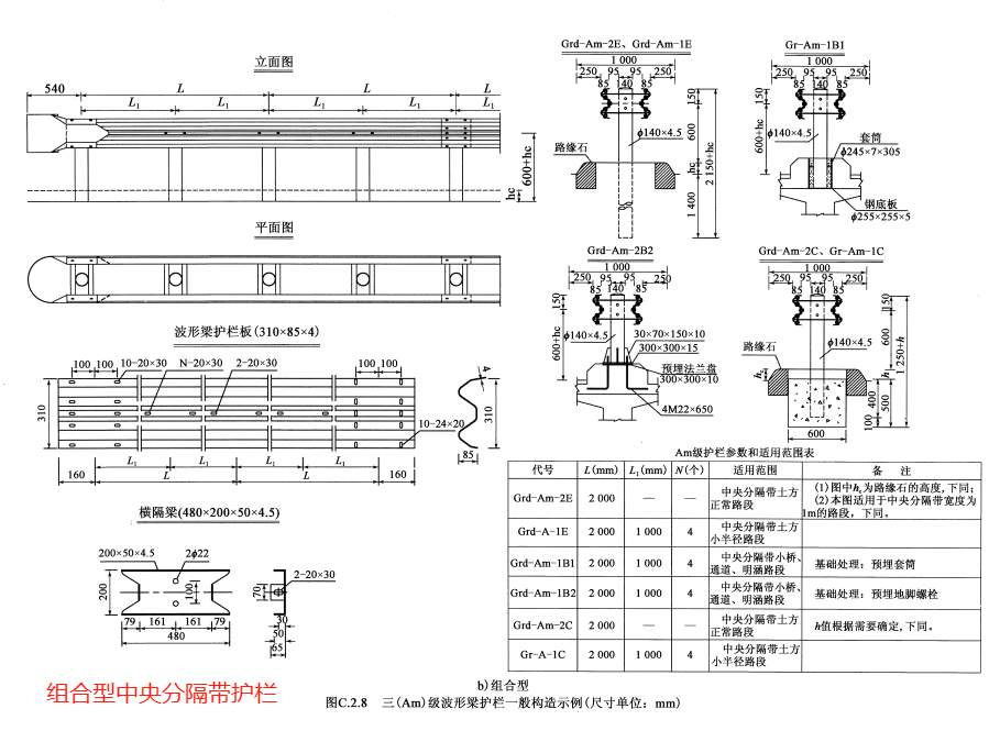 防護等級代碼分別為Am、SBm、SAm、SSm、HBm級的分設型中央分隔帶護欄的構造形式與代碼分別為A、SB、SA、SS、HB級的路側護欄基本相同。