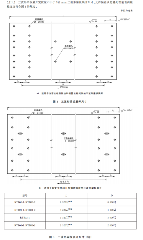 m) 增加了三波形梁板中部連接螺孔數(shù)量應(yīng)根據(jù)鋼管立柱間距設(shè)置的要求、展開尺寸及允許偏差的要求(見5.2.1.1~5.2.1.3);