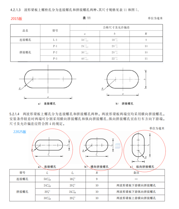 另外還更改了兩波形梁板螺孔規格,增加了縱向拼接螺孔。2025標準要求安裝條件較差時兩端可分別采用橫向拼接螺孔和縱向拼接螺孔,縱向拼接螺孔宜在行車方向下游端。