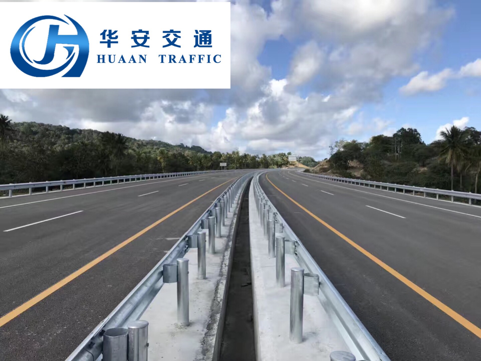 高速護欄由兩塊波形鋼護欄板和兩個固定并夾持在其之間的支柱組成。在高速公路中間設置波浪形護欄板支撐的連續結構,有效地實現了隔離保護功能。同時與公路外側護欄帶相對應,統一美觀。